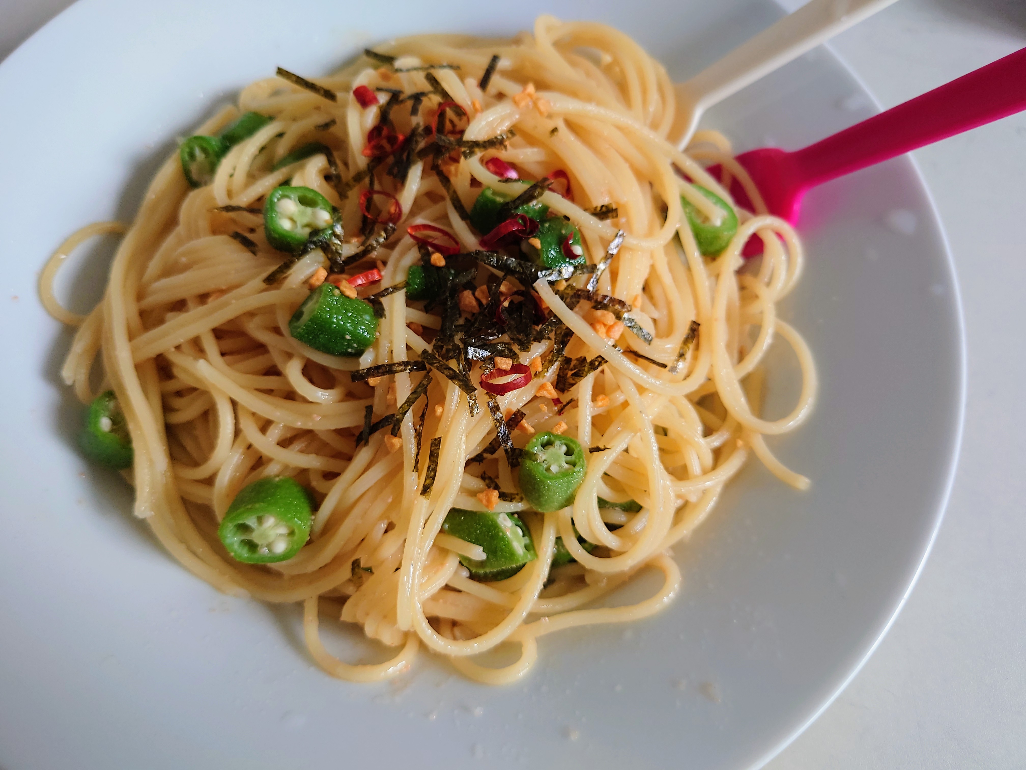 今日は、オクラたっぷりの明太ペペロンチーノパスタです😋 オクラはすぐに使えるように洗って冷凍保存してあります!便利ですね😊 ウメ
