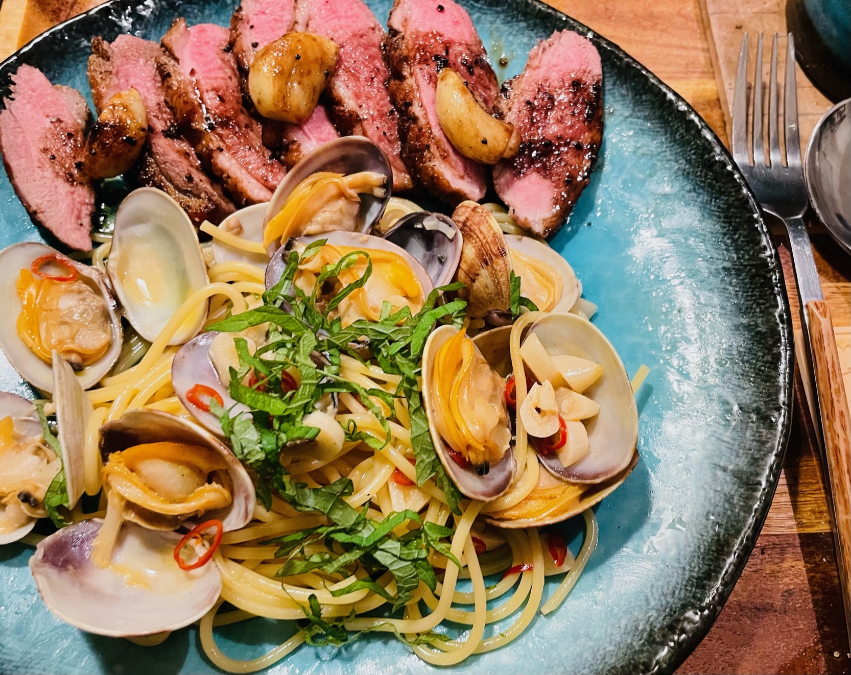 パスタと鴨のロースト! お客さん食材、ありがとうございます(^^)
