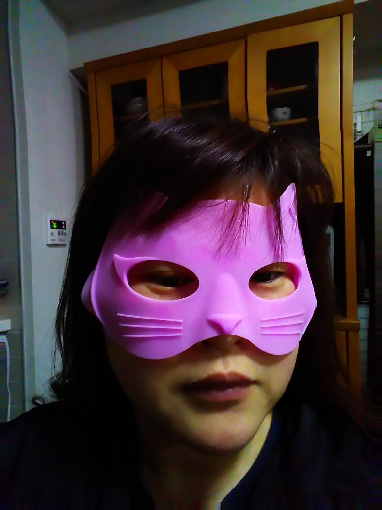 待機中‼️私は朝このように顔ツボマッサ―ジをしています🎭お面の裏には凸凹がついていて押すと痛気持ちよくて、とってもいいです🎵
