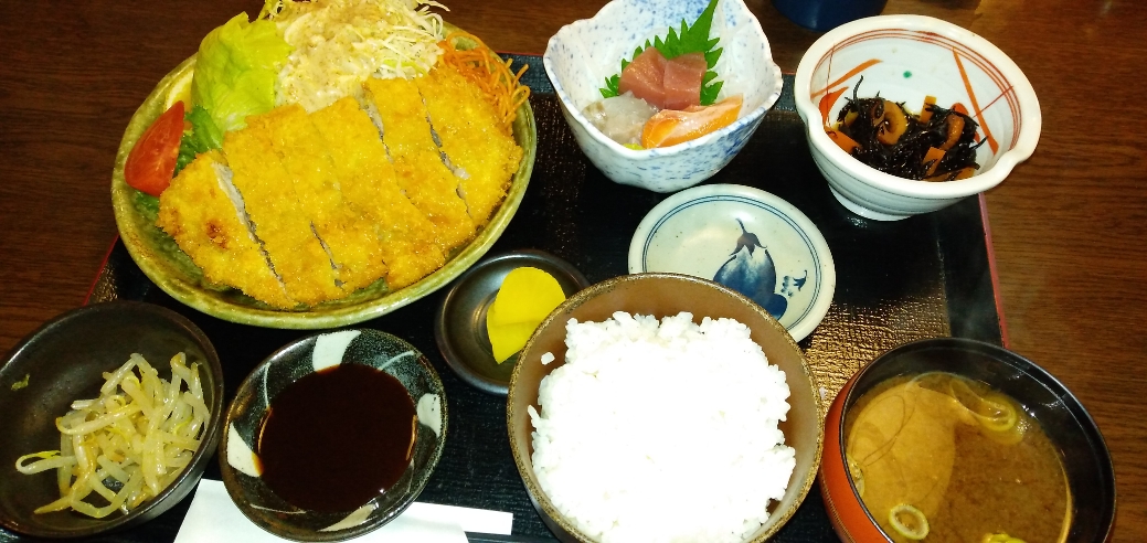 ランチは豚カツ定食🐽今日は部長とすーさんと🍚珍しいカレー串カツも頂きました!お腹いっぱ~い!部長ご馳走さまでした😋