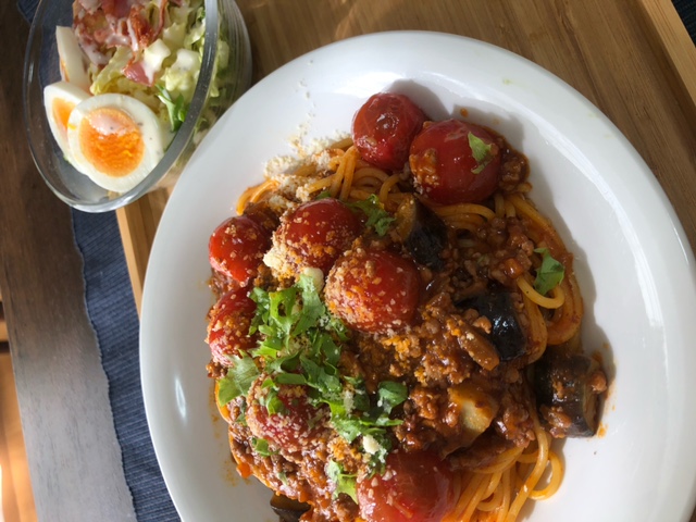 ミニトマトと茄子のミートパスタ