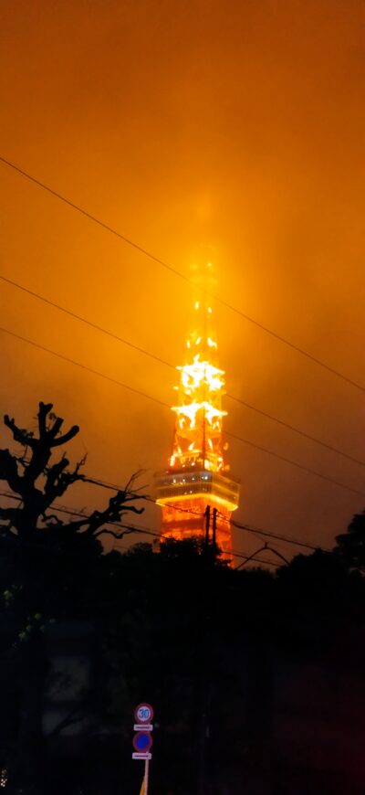 東京夜は少し霧雨状態で東京タワーが霞かかっています
